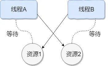 如下图所示,线程 A 持有资源 2,线程 B 持有资源 1,他们同时都想申请对方的资源,所以这两个线程就会互相等待而进入死锁状态。