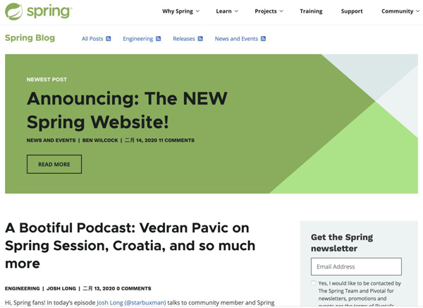 打开 Spring 官网,在顶部菜单里有一个选项就是 Blog,关于 Spring 家族产品的任何更新计划,更新结果,都会在这里通知到大家。