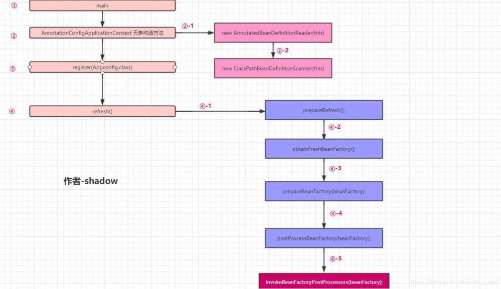 继而②-2spring又实例化了一个ClassPathBeanDefinitionScanner对象,这个对象顾名思义就是能够用来完成spring的扫描功能,但是这里提一句——spring内部完成扫描功能并不是用的这个对象,而是在扫描的时候又new了一个新的ClassPathBeanDefinitionScanner对象;换言之这里spring new的对象我们假设他为a,但是spring在真正完成扫描的时候又new了一个b,但是是同一个类都是ClassPathBeanDefinitionScanner,但是为什么需要两个? 3、 直接用a不就可以了吗?如果spring内部完成扫描时候没用a,那么a被new出来在哪里使用了? (问题三)到此为止第②步完成; ③ 调用register(Appconfig.class);首先会把Appconfig类解析成为一个beanDefintion对象(如何把一个类解析称为beanDefinition对象的?这里其实涉及到②-1AnnotatedBeanDefinitionReader对象的意义,如果你明白了②-1这里也就明白了),然后给解析出来的beanDefinition对象设置一些默认属性,继而put到beanDefintionMap当中;为什么需要put到beanDefintionMap呢?在上一篇我们已经解释过这个map就是单纯用来存储beanDefinition的,spring后面会遍历这个map根据map当中的beanDefinition来实例化bean,如果Appconfig类的beanDefintion存在在map当中那么他必然会被spring容器实例化称为一个bean?为什么Appconfig会需要实例化呢?因为Appconfig当中有很多加了@Bean的方法,这些方法需要被调用,故而需要实例化,但是Appconfig类的实例化很复杂比一般类实例化过程复杂很多,涉及到代理涉及到cglib等等,这个我们后面文章解释;这里还需要解释一个问题,为什么Appconfig类是通过register(Appconfig.class);手动put到map当中呢?为什么不是扫描出来的呢?(一般类都是通过扫描出来的),其实也很简单,因为他无法扫描自己,一般类是spring通过解析Appconfig上的@ComponentScan注解然后被扫描到,所以无法扫描自己;接下来便是第 ④ 步,④-1到④-4以后分析, ④-5 便是我们上篇文章说的执行spring当中的bean工厂后置处理器,也是本文重点讨论的;下图是对上述文字的一个说明——spring容器启动的执行顺序