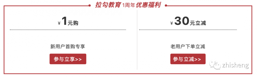二来 拉勾教育 1 周年啦,他们推出了一个全场课程首购¥1 ,老用户立减 ¥30 的活动,我看了看觉得值得推荐,就来推荐一下。