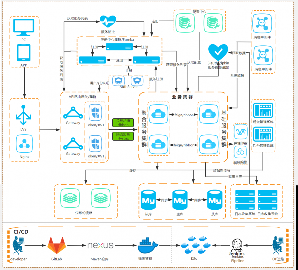 基于SpringCloud开发基于微服务架构的交易平台,首先需要对SpringCloud的基础架构有所了解,我们熟知的SpringCloud微服务架构如下图所示: