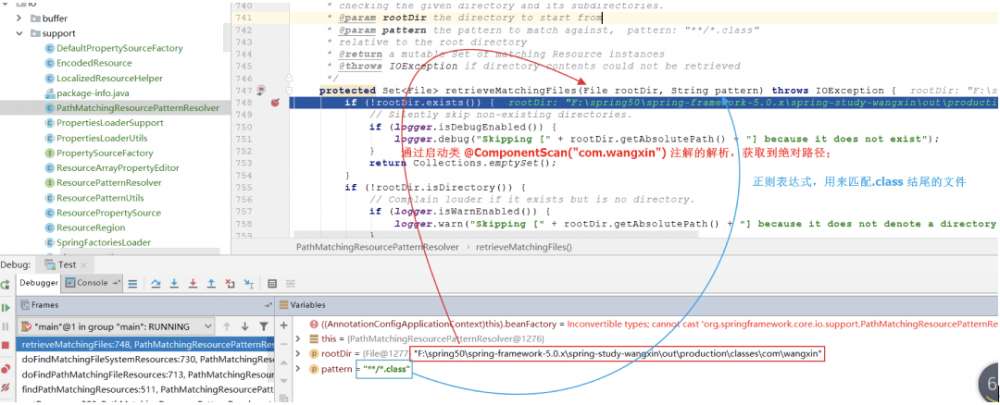 后来带着目的性去阅读,比如我先定个小目标,“Spring如何获取class文件的?”这一个问题入手,开始阅读。用gradle编译好源码后,从AnnotationConfigApplicationContext的构造方法开始,一阵凌乱的Debug后,得到最终“一目了然”的方法(如下图所示)。看到这个方法后,先不用看方法体,只看入参,大概就明白了Spring是怎么做的,拿到绝对路径,再根据正则表达式,获取所有本路径下的 class 文件。然而到这个“干实事儿”的方法经历了20多次调用过程,我也是Debug了十分钟才拿到最核心的方法。