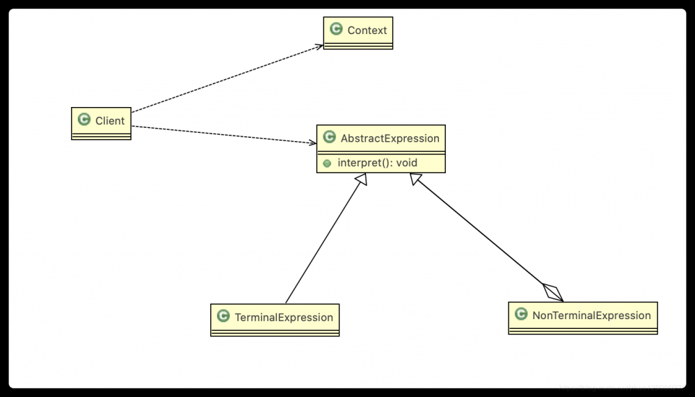 2)AbstractExpression :抽象表达式,声明一个抽象的解释操作,这个方法为抽象语法树中所有的节点所共享。