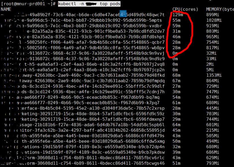 这里使用kubectl top pods 命令确定CPU占用最高的pods都是哪些。