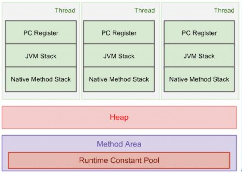 方法区被所有线程共享;方法区是用来存储编译后的代码,即存储每个类的运行时常量池、字段和方法。