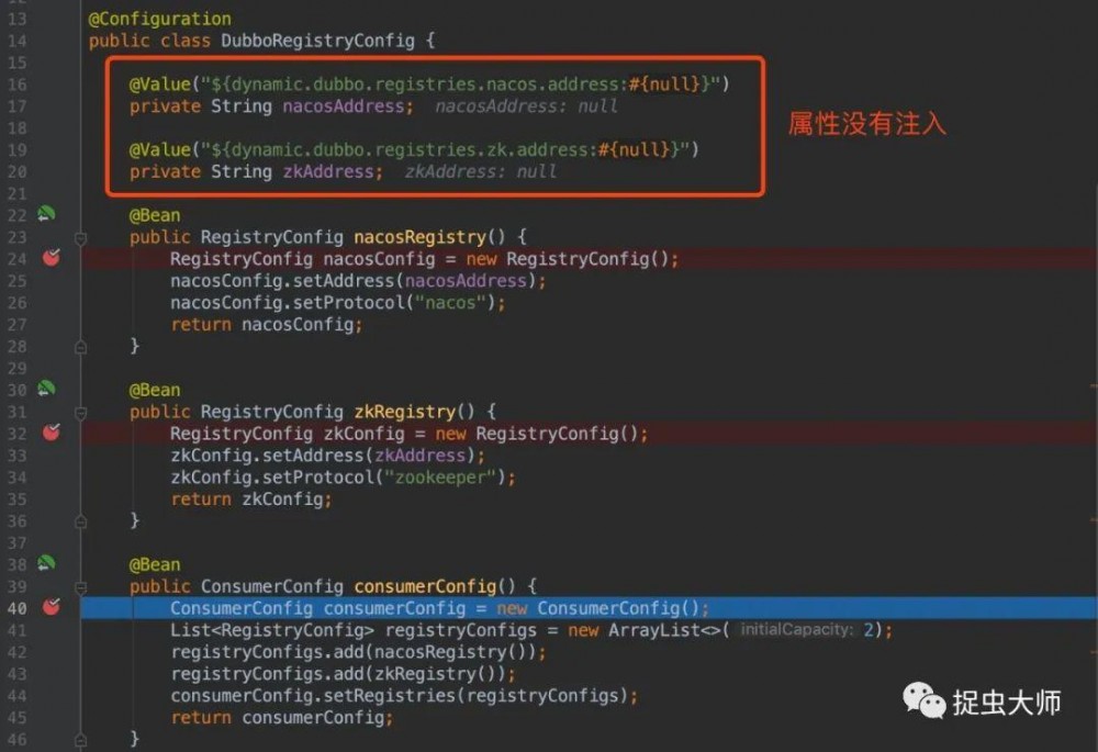 先捋一捋,我们最初的问题是 @Configuration 无法注入 @Value ,通过 @Import 导入 @Configuration , @Configuration 本身不是一个bean,自然@Value就无法装配属性,但当我们改成包扫描后,能获取到@Configuration本身的bean,但是属性依然没有注入 @PostConstruct 依然没有执行。 bean生成了,但 @Value 与 @PostConstruct 注解没有生效,我们把焦点放到这两个注解上,这两个注解是怎么实现的?查询了一下资料, @PostConstruct 是依靠 InitDestroyAnnotationBeanPostProcessor 实现,@Value是依靠 AutowiredAnnotationBeanPostProcessor 实现,从名字上就能看出这两个类实现了 BeanPostProcesser , BeanPostProcesser 提供了在bean执行初始化(init-method)前后插入hock的能力。也就是说, DubboRegistryConfig 的bean没有执行 BeanPostProcesser ,为了验证猜想,断点找出堆栈,顺藤摸瓜
