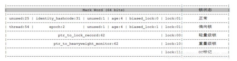 java为了支持锁对象,在对象头上做了上图的设计,markword是对象头中的一部分,64位虚拟机占64bit,markword在不同等级锁状态下存储的内容是不同的,上图是锁处于不同状态时markword存储的内容。