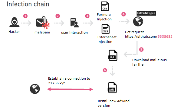 初始的攻击向量是从一个包含office文件附件的钓鱼邮件开始的。该文件是格式为很早的BIFF格式,因此无法被常见的office解析工具解析。在下一个阶段,会下载一个恶意JAR文件。该文件经过了严重混淆,其中携带了多种绕过技术来绕过安全产品的监测。然后jar文件会释放一个Adwind RAT,Adwind是一款多平台的恶意软件,被配置为窃取敏感信息,获取受害者机器的远程访问权限后会发送窃取的信息到攻击者的C2服务器。