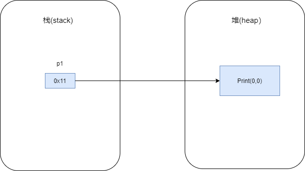 我们要注意到,在堆中的对象 Print(0,0) 并没有发生改变,改变的只有引用 p1 指向的地址。