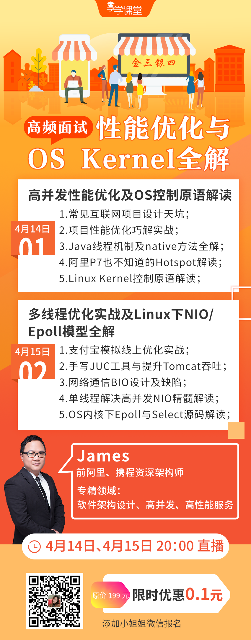性能优化,是升职跳槽进大厂的必备技能。 我特地邀请了性能优化大牛,前阿里资深架构师James老师为大家带来 《金三银四-高频面试之性能优化与OS Kernel全解》 实战直播课 ,快速提升性能优化技巧,升职跳槽更有底气!