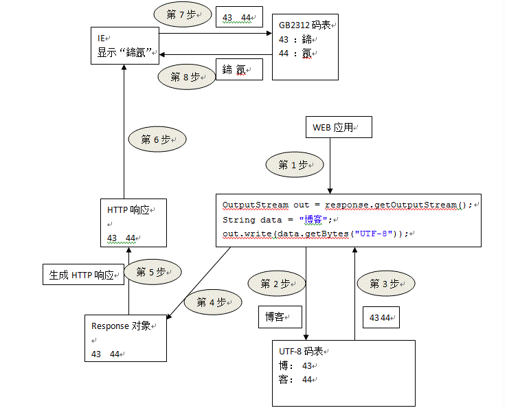 首先 getBytes() 以 UTF-8 字符集对字符串进行编码,并写入响应对象,响应数据回送至浏览器,浏览器默认使用平台默认编码(中文系统)进行解码,用 GB 码表解码 UTF-8 的编码的数据,结果就是出现乱码。