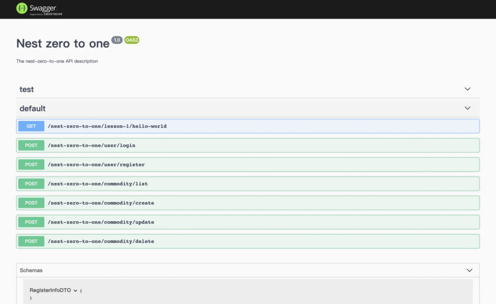 这就是 Swagger UI,页面列出了我们之前写的 Router 和 DTO (即图中的 Schemas)