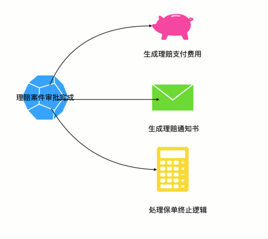 当一个保险理赔申请提交,通过一系列的流程审核,确定理赔金额等数据无误后会有专人进行最后的二次审批,如果审批通过就可以支付给保险受益人相关的费用。从业务上看,理赔审批通过后,会有一连串的后台业务操作,首先是财务费用以及相关凭证的生产,然后是理赔通知书的生成与发送,如果保单由于理赔终止则需要对保单进行进一步的操作。这些业务行为无疑引入了数个 Aggregation 对象,肯定无法通过唯一的 Aggregation 在一个事务内完成,所以必须引入领域事件。以下是业务与事件的关系图: