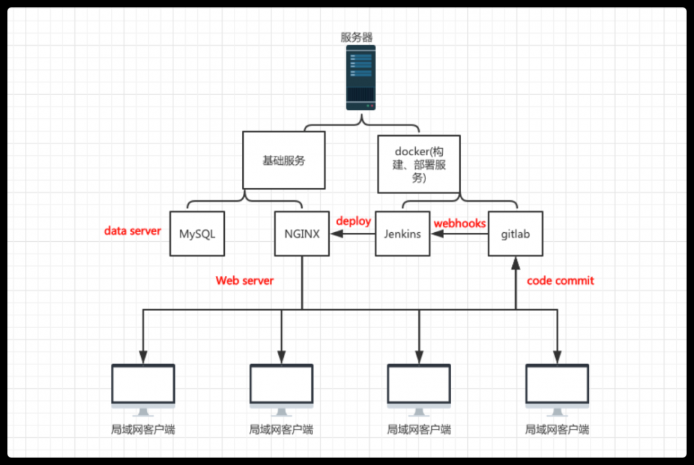 文本主要的内容是,利用Jenkins+gitlab+NGINX+MySQL+docker搭建一套公司内部级别的开发、测试系统。整个系统的流程图如下。