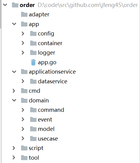 上面就是订单服务的目录结构,其中“Domain”对应领域层, “applicationservice”对应程序层和基础设施层,“app”对应程序容器。