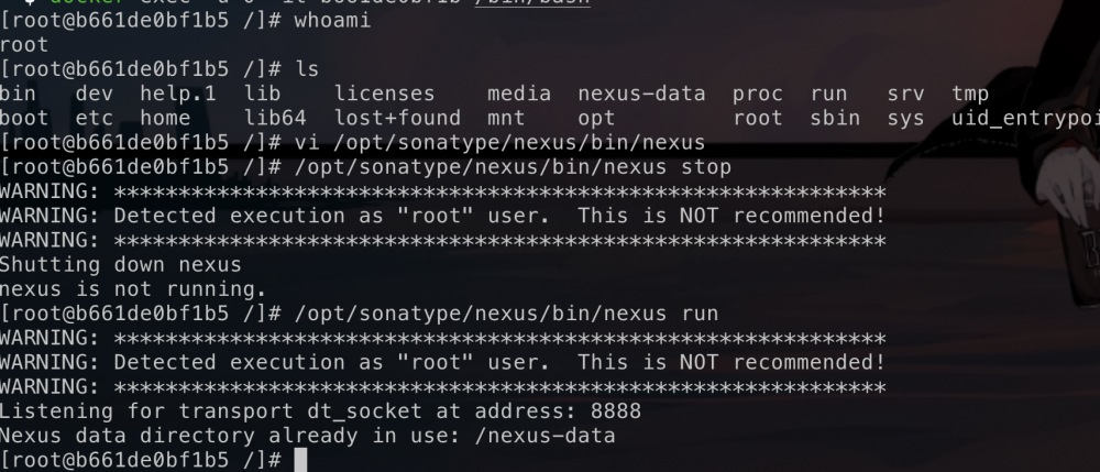 然后切成root用户进入容器修改启动项 /opt/sonatype/nexus/bin/nexus