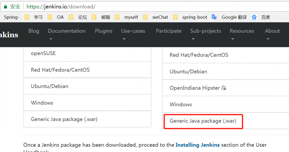 1、下载Jenkins地址 https://jenkins.io/download/,在最下面找到如果所示.war,下载就行。
