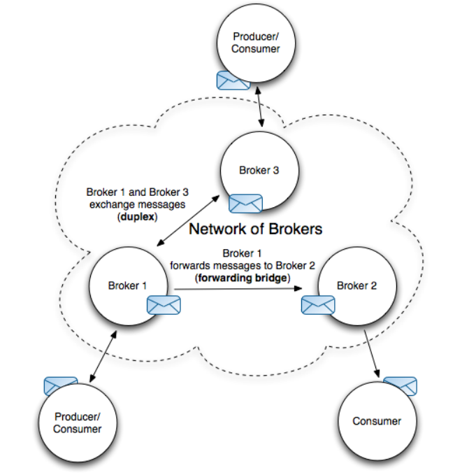 当系统需要高性能以及扩展性的时候,单个broker已经不满足我们的需求了,我们可以把多个broker连接起来,来达到我们需要的效果。ActiveMQ支持双向的网络连接通道,如下图所示