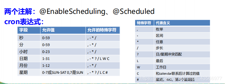 @Scheduled(cron = "0/4 * * * * MON-SAT") //每4秒执行一次