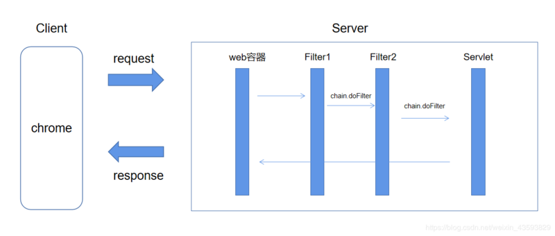 每当发起一个HTTP请求,就会匹配filter的urlPattern,如果匹配上则进入filter的doFilter方法,多个filter的顺序调用需要显式的调用chain.doFilter方法
