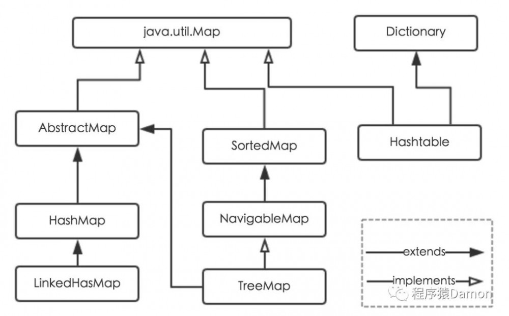 它的子孙下面有我们常用的 HashMap、LinkedHashMap,也有 TreeMap,另外还有继承 Dictionary、实现 Map 接口的 Hashtable。