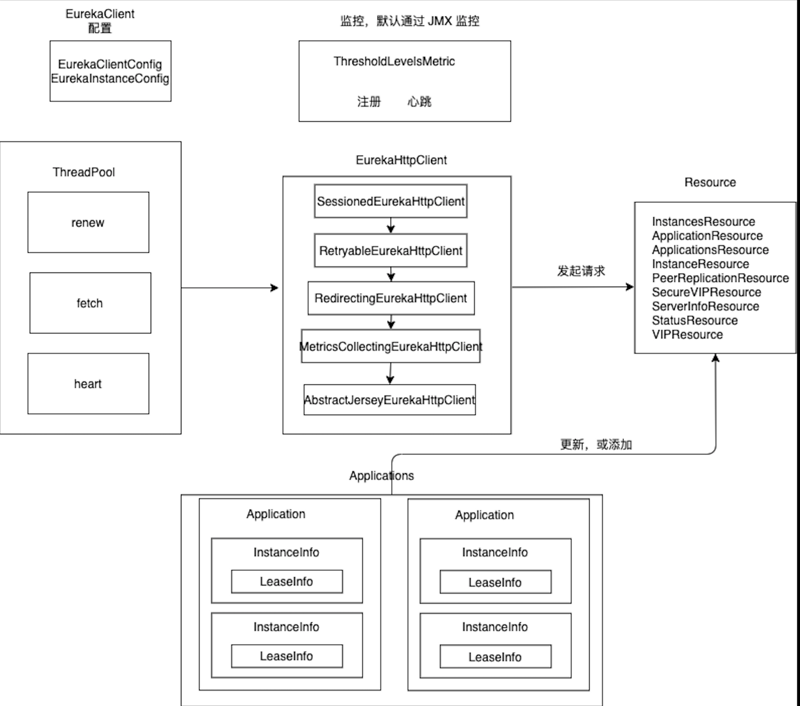 注册逻辑相对比较简单,比较有意思时,在上面介绍 eureka 组件的时候,eureka client 有个 EurekaHttpClient 组件。设计有点类似责任链设计模式。在链上的每个类都有机会处理 AbstractJerseyEurekaHttpClient 执行的结果。