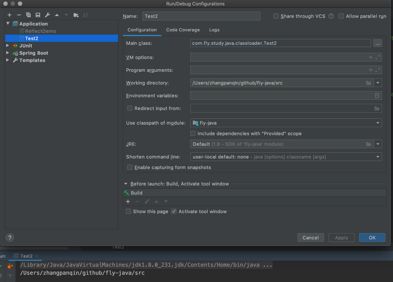 <font color=red>什么是用户工作目录呢?就是执行 java 命令的目录。</font>在那个目录下执行命令,usr.dir 就会被 java 虚拟机赋值为执行命令的路径。我在 /Users/zhangpanqin/github/fly-java/test 目录下运行编译的 class 文件。 -cp 指定 classpath 路径。