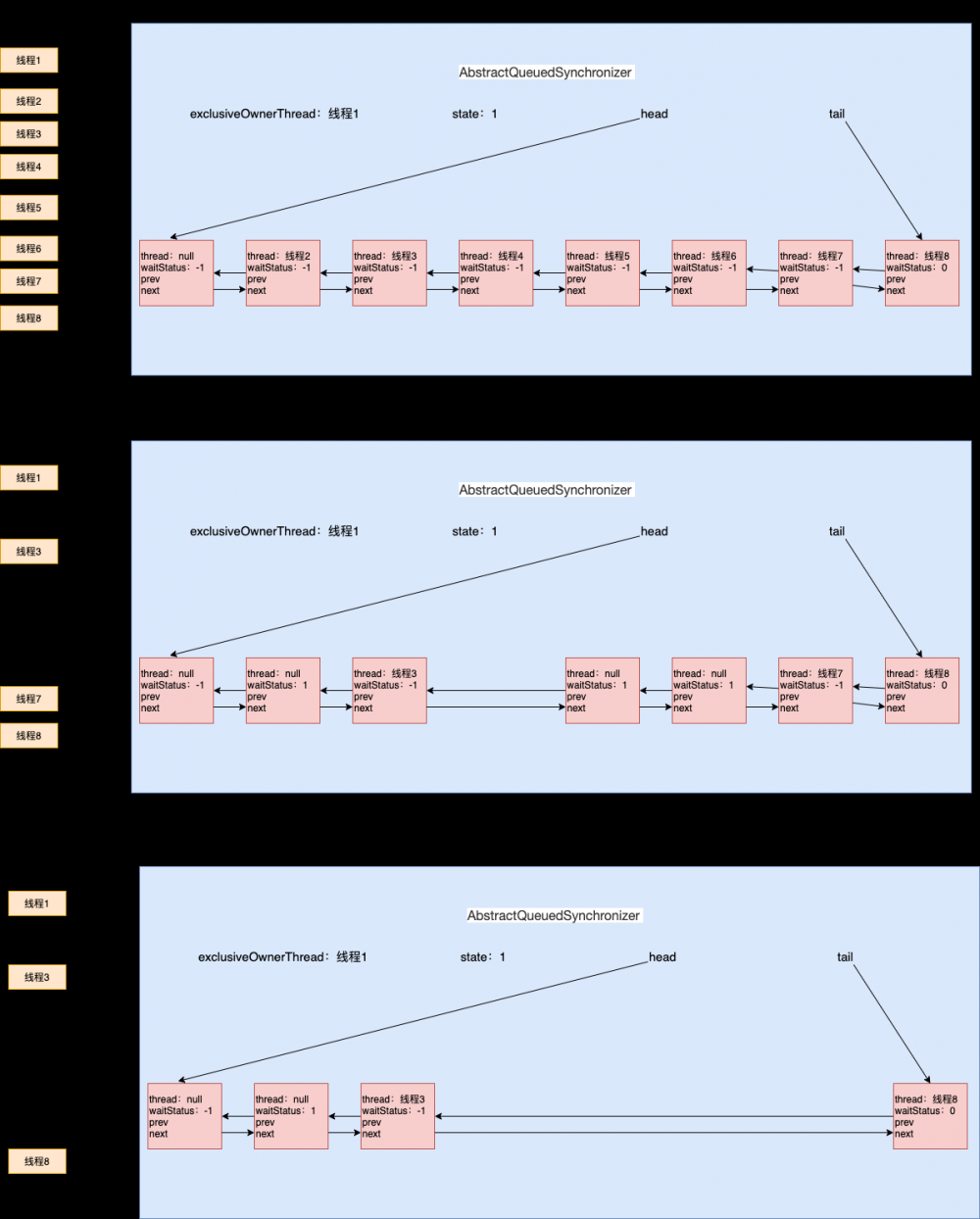 来张图说明下,假如我们目前等待队列里有7个线程。我们尝试中断线程7我们假设 CAS 操作都能成功: