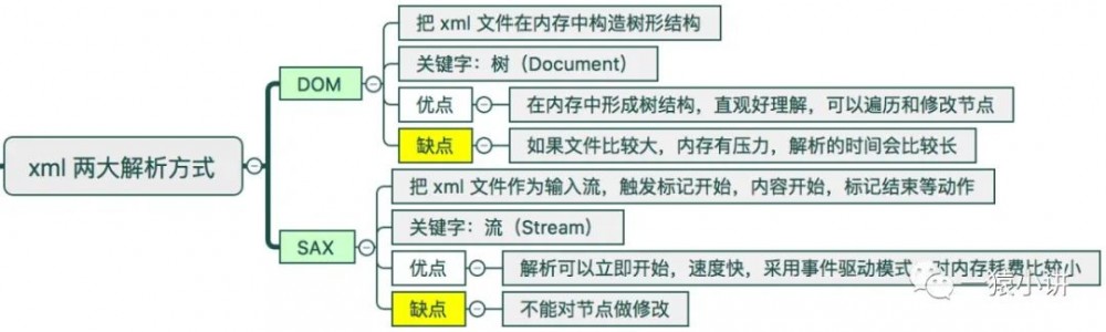如导图所示,DOM 和 SAX 是 XML 常见的两大核心解析方式,两者的主要区别在于它们解析 XML 文件的方式不同。使用 DOM 解析,XML 文件以 DOM 树形结构加载入内存,而 SAX 采用的是事件模型。
