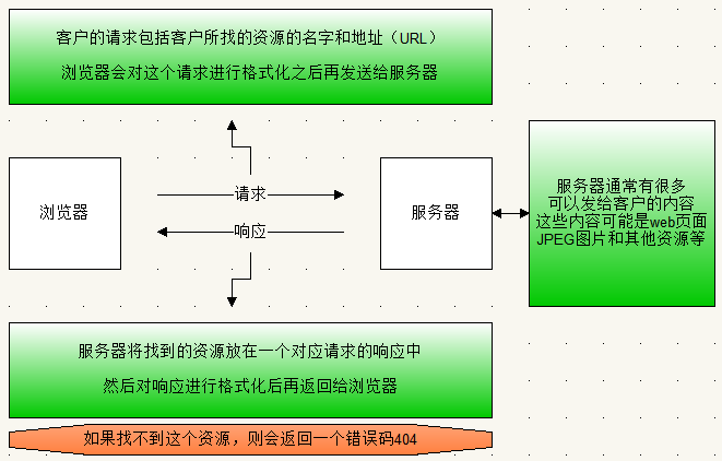 文字描述:客户端可以通过浏览器请求一个资源(可能是一个页面,一个图片,一个PDF文档等),服务器接收到客户端的这个请求之后按照请求中的路径来查找这个资源,如果找到了,创建一个对应该请求的响应,把找到的内容放到响应中,格式化响应后,返回这个响应(包括响应头和响应体),如果没找到,直接返回错误代码404,浏览器接到响应后,解析HTML然后展示给用户,所有浏览器都知道该如何处理HTML。
