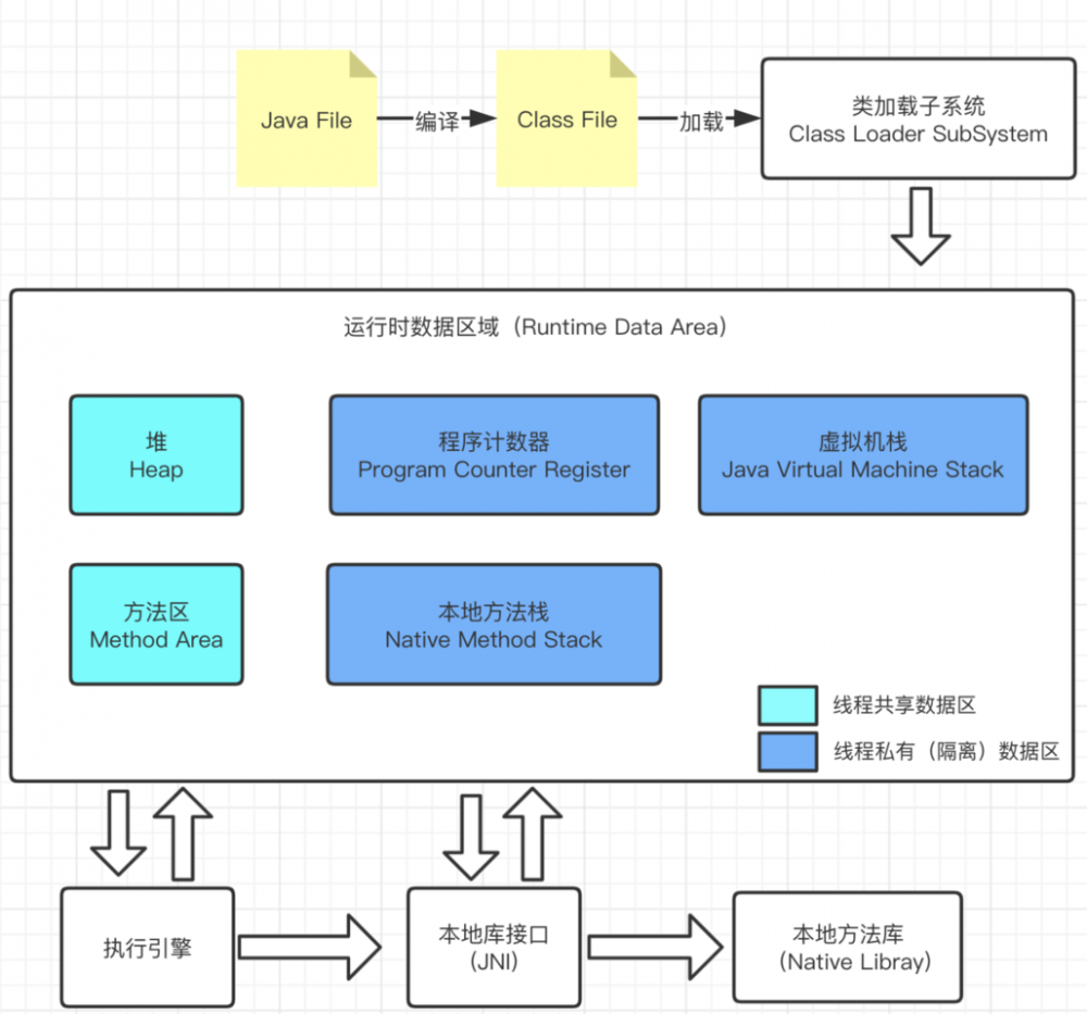 如上图所示,运行时候数据区主要划分成5大块: 程序计数器(Program Counter Register)、虚拟机栈(Java Virtual Machine Stack)、本地方法栈(Native Method Stack)、方法区(Method)、堆(Heap) 。按照线程共享的角度上来看,又分为 线程共享数据区 和 线程隔离数据区 。
