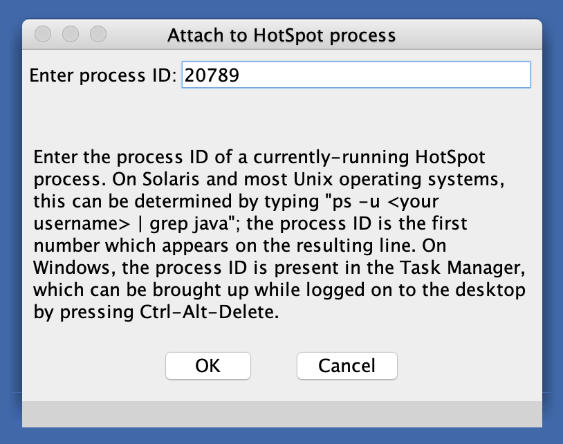 sudo java -cp /Library/Java/JavaVirtualMachines/jdk1.8.0_171.jdk/Contents/Home/lib/sa-jdi.jar sun.jvm.hotspot.HSDB jps 获取到 java 进程 id
