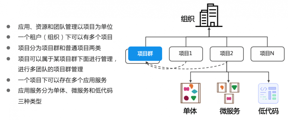 “项目视图空间”是整个应用生命周期管理的工作空间,是应用设计、构建、运行和管理各环节相关团队共同沟通协作的单一视图,也是应用团队和最终用户沟通协作的单一视图。