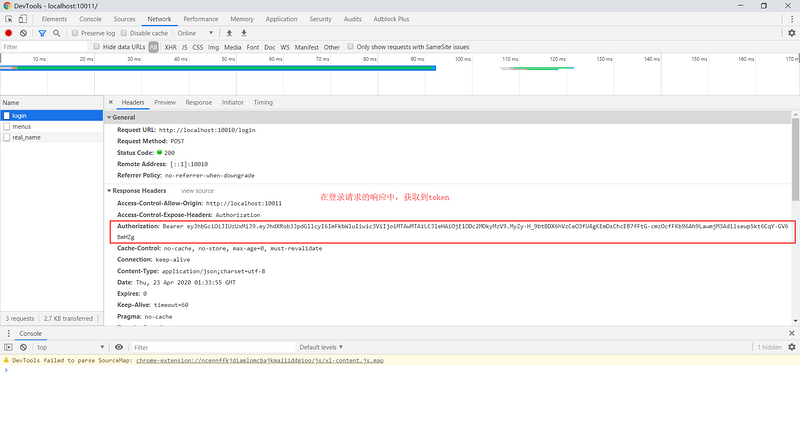 现在,登录请求的响应头中已经增加了保存着token的Authorization。