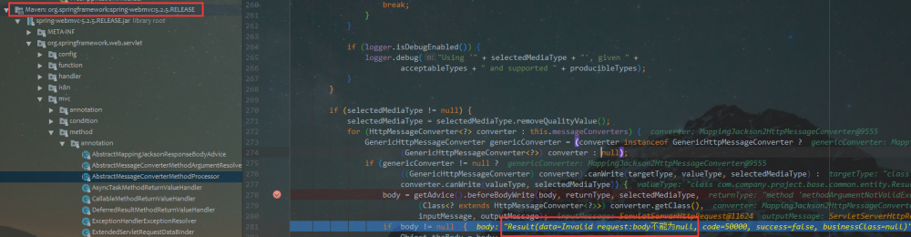NotNull 到底是在哪里被处理,我先打印一个错误信息,根据错误信息的关键字,我首先找到的是这个地方,可以看到是webmvc包,可以理解,毕竟是通过接口请求并拦截的,需要经过webmvc
