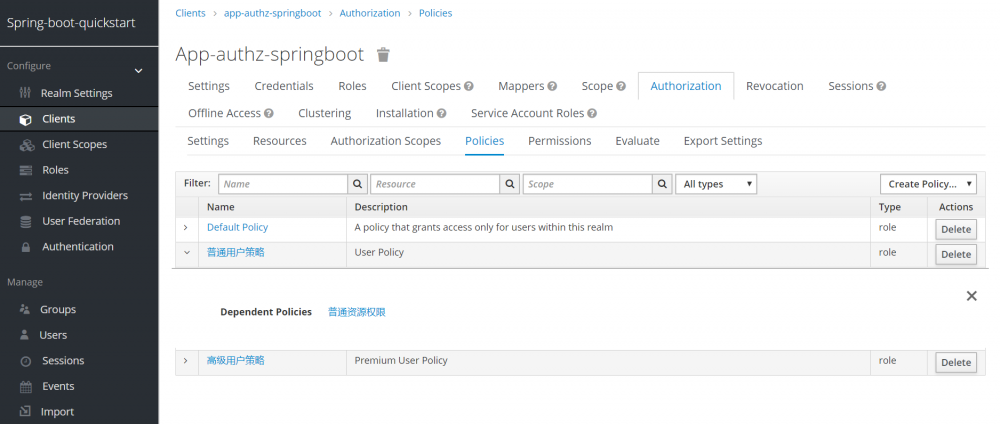 主要查看Authorization中的 Resources Policies Permissions 是否有效。