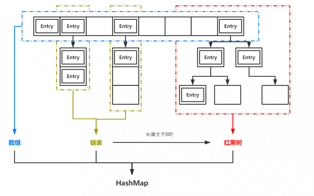 HashMap是Java中一中非常常用的数据结构,也基本是面试中的“必考题”。它实现了基于“K-V”形式的键值对的高效存取。JDK1.7之前,HashMap是基于数组+链表实现的,1.8以后,HashMap的底层实现中加入了红黑树用于提升查找效率。