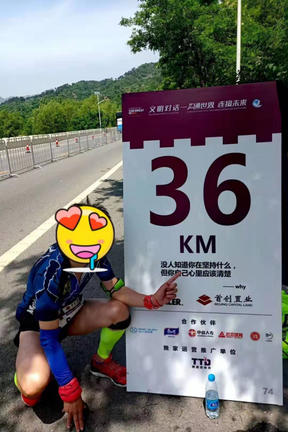 于是在 36 公里的地方碰到了我提交的标语,非常开心,停下来拍了几张照片。给自己说:坚持不住的时候再坚持一下。