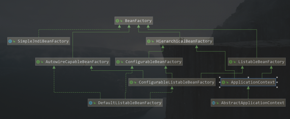 在继承的关系中我们可以看到都是接口和抽象类为主,多层次的封装,最终的实现类如 DefaultListableBeanFactory ,还有类似 AbstractApplicationContext 的抽象子类,在spring中这些接口都有自己特定的使用场景,对每种场景中不同对象的创建传递到转化的过程中都进行了相应的控制限制,有很强的领域划分,职责单一可扩展性极强