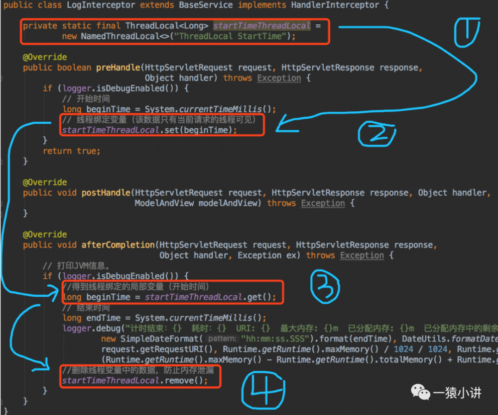 上图是老项目真实在用的一个场景,主要借助 ThreadLocal 统计请求处理的耗时。仔细去看 ThreadLocal 使用起来其实蛮简单,接下来通过一段代码,让你快速掌握 ThreadLocal 的使用。