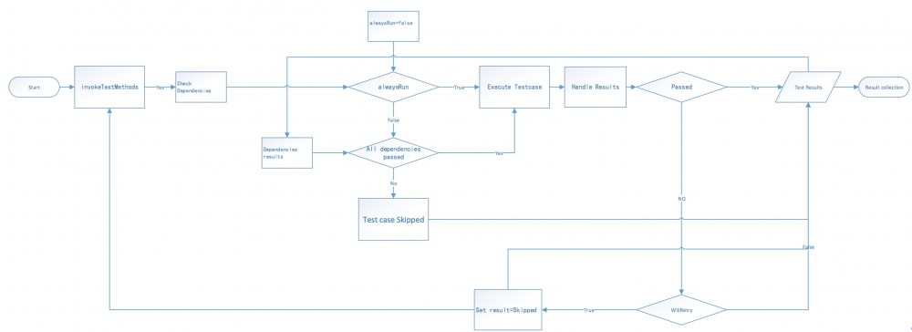 TestListenerAdapter 方法重写 根据上面分析的TestNG逻辑,在对依赖测试用例的结果进行检查时,如果忽略重跑的中间结果只检查最后一次的运行结果,可以达到需求的目的。对于测试报告,同样的处理方式,忽略所有中间的测试用例运行结果,只记录最后结果。 测试用例的中间运行结果为 Skipped ,下面的代码通过重写 TestListenerAdapter 的 onTestSuccess() 和 onTestFailure() 方法,对测试用例的中间结果 skipped 进行了删除。代码如下: