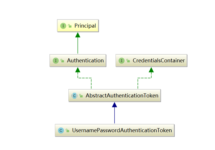Authentication是认证信息的载体,在Spring Security中,我们在尝试登陆向服务器发送请求时候包含的用户名和密码是Authentication,在这种场景下,我们更多见到的是带后缀Token的形式;当我们登陆成功之后,用于在上下文中标识我们具体身份信息的还是Authentication。 我们对 AbstractAuthenticationToken 进一步的展开进行讨论, AbstractAuthenticationToken 实现了两个主要的接口,用于保存身份主体信息的Principal和Authentication一支,用于保存认证凭证比如密码的CredentialsContainer。通常生命周期在提交验证的那一刹那就结束了。验证完毕后,存储至``SecurityContext 通常是不包含验证敏感信息的 Authentication`形式。