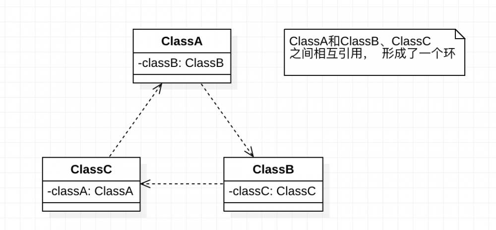 循环依赖就是循环引用,就是两个或者多个bean相互之间的持有对方,比如A引用B,B引用C,C引用A,则它们最终反映为一个环,参考下图: