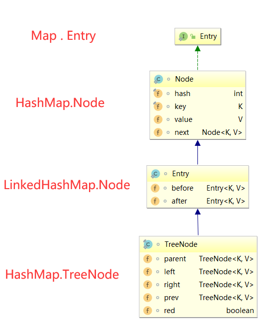 当你看过一遍Map主要实现类的源码之后,应该会对这几个对象比较熟悉,HashMap 内部类Node实现了内部接口Map.Entry; LinkedHashMap 内部类 Entry 继承自 HashMap 内部类 Node,并新增了两个引用,分别是 before 和 after用于维护双向链表。同时,TreeNode 继承 LinkedHashMap 的内部类 Entry 后,就具备了和其他 Entry 一起组成链表的能力,至于每一个成员变量的含义在对应的文章中已经说明了;