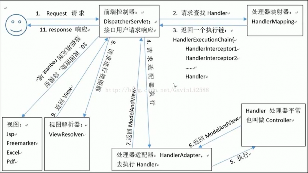 用户请求到达前端控制器,它就相当于MVC模式中的C,DispatcherServlet是整个流程控制的中心,由它调用其他组件处理用户的请求,DispatherServlet的存在降低了组件之间的耦合度