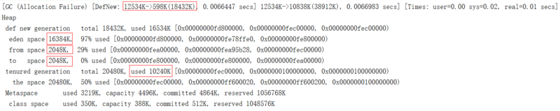 -XX:SurvivorRatio=8 。 byte 数组可以分配,但是,分配第四个的时候,空间不够,所以,需要进行一次 Minor GC ,GC之后,新生代从 12534K 变为 598K 。 Minor GC 之后,进入到了 Survivor ,但是,Survivor不够分配,所以进入到了 老年代 ,老年代已用内存达到了 50% 。 所以,经过上面的例子我们发现,对象一般优先在新生代分配的,如果新生代内存不够,就进行Minor GC回收内存。
