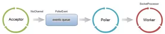 在NIO实现的Connector中,处理请求的主要实体是NIoEndpoint对象。NIoEndpoint中除了包含Acceptor和Worker外,还是用了Poller,处理流程如下图所示(图片来源: http://gearever.iteye.com/blo... )。