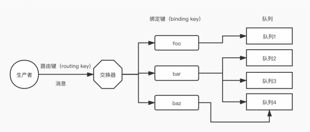 生产者发送消息的过程,会比较复杂一点。消息并不是直接到达队列,而是要经过交换器(exchange)的分配。交换器和队列是有对应关系的,这个关系可以使用绑定键(binding key)来表示,如下图。交换器可以有多个绑定键,绑定键可以对应一个或多个队列,队列也可以对应多个绑定键。