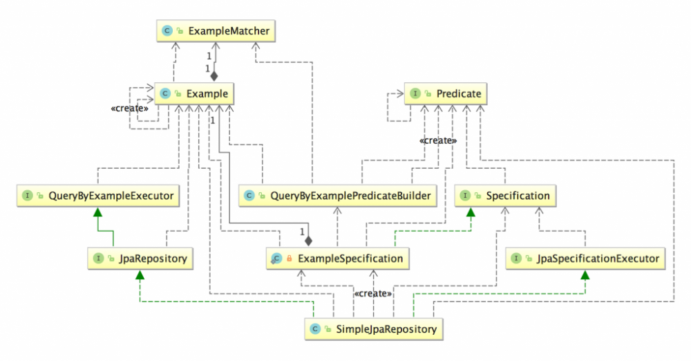 从 UML 图中,可以看出继承 JpaRepository 接口后,自动拥有了按“实例”进行查询的诸多方法,可见 Spring Data 的团队已经认为了 QBE 是 Spring JPA 的基本功能了,继承 QueryByExampleExecutor 和继承 JpaRepository 都会有这些基本方法,所以 QueryByExampleExecutor 位于 Spring Data Common 中,而 JpaRepository 位于 Spring Data JPA 中。