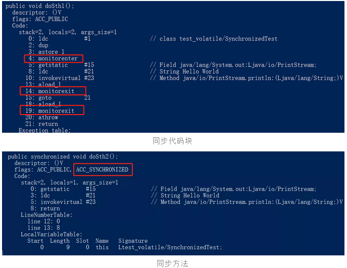 从反编译后的结果中可以看到:对于同步方法,JVM采用ACC_synchronized标记符来实现同步。对于同步代码块。JVM采用monitorenter、monitorexit两个指令来实现同步。